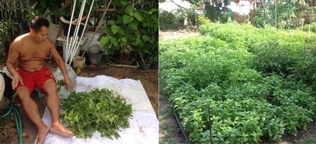 Pansri Kaikaew showed off his 100-sq.-meter garden in the yard of his employer to reporters May 10. There, in a patch of land that once was left wild and overgrown with weeds, he now cultivates sweet basil, eggplant, papaya and morning glory to deliver to local restaurants and neighbors.