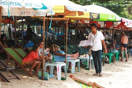 “I haven’t been sitting idly by. I send officers daily to the beach to fine vendors,” said Maj. Col. Jeerawat Sukhonzup, head of enforcement for Municipal District 2, which covers the shoreline from North Pattaya to Thepprasit Road. With only 10 officers on shift at a time, however, there’s no way to regulate the hundreds of vendors hawking food and wares on the beachfront, he said.