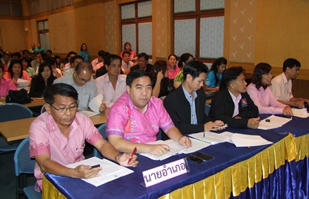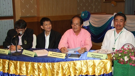 Chonburi Gov. Khomsan Ekachai (2nd left) meets with officials to discuss their monthly agenda.Chonburi Gov. Khomsan Ekachai (2nd left) meets with officials to discuss their monthly agenda.