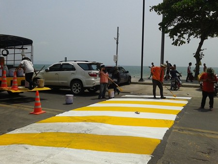 Pattaya road workers are hoping to improve safety for both motorists and pedestrians by repainting faded crosswalks.