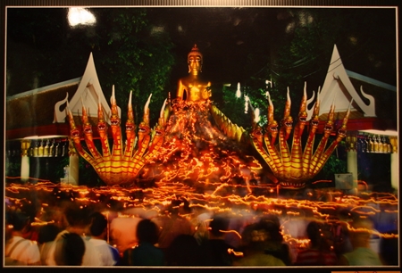 Mayor Itthiphol Kunplome and Sawat Pattiphanprasert, president of the Federation of Photographic Associations of Thailand, congratulate Sanchai Lungrung, who’s photo “Sawan Tawanork” (background) won Pattaya’s second-annual photo contest.