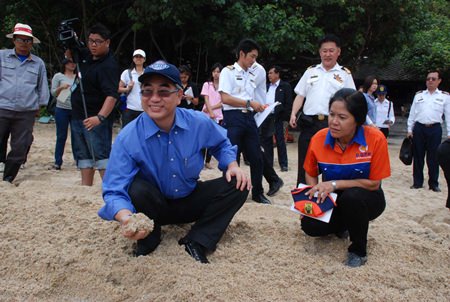 Natural Resources and the Environment Minister Vichet Kasemthongsri smiles as he checks the sand for a photo op on Ao Phrao beach.