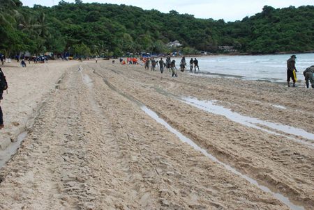 While PTTGC hauled away much of the tainted sand a week ago, the oil had seeped deep into the beachhead. On Aug. 6, Maptaput’s “Friend to Friend” group and Koh Samet authorities began digging up and overturning sand, hauling away the badly soaked and using sieves to clean what could be saved.