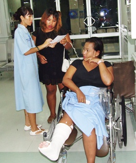 A Korat woman broke a leg when she fell from an amusement park ride missing any safety equipment at the Pattaya Grand Sale Fair.