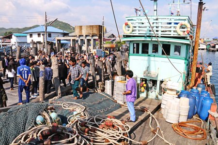 Labor Minister Sirichai Distakul (bottom, center with white shirt and glasses) visited the “Port-in, Port-Out” center in Samae San to review its work in eliminating human trafficking from the fishing industry.