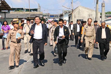 Labor Minister Sirichai Distakul inspected the “Port-in, Port-Out” center in Samae San to review its work in eliminating human trafficking from the fishing industry.