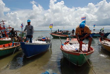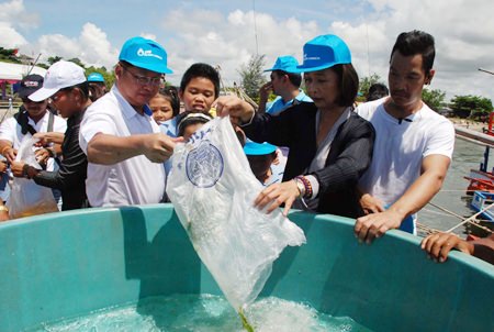 Rayong’s Fishing Department enlisted school children, local residents and local officials to help them release more than 7 million shrimp, crabs and fish into the sea.