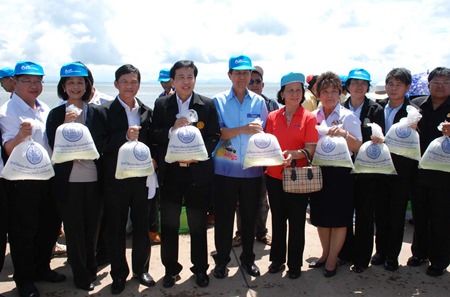 Department Director-General Vimol Janthrarothai hosted the animal release in Makhampom, Krum Kaleng Sept. 2. PTT Global Chemical Plc, the company responsible for the July 27 oil spill that blackened beaches on Koh Samet, sponsored the release of 2.5 million banana shrimp, 4.6 million tiger prawns, 230,000 blue crabs and 50,000 silver perch.