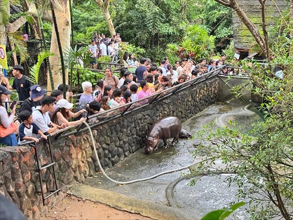 On September 24, reporters visited the hippopotamus exhibit at Khao Kheow Open Zoo in Sriracha, Chonburi. Despite it being a weekday, both local and international tourists flooded the zoo with one goal in mind—to catch a glimpse of Moo Deng, the hippo that has reignited tourist interest in the zoo, leading to unprecedented attendance figures.