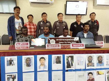 Anthony Chibuike Chukwu, 33, Charles Ikenna Nnadi, 29, Henry Onukwube Nwigwe, 27, and Martins Chimezie Nnenna, 30, were apprehended at a Soi Khao Talo residence Nov. 12. Police also seized computers and bank books.