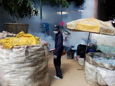Pattaya Health Department sent out workers to spray insecticide to kill off dengue fever-carrying mosquitoes on Khopai Sois 13-14 and Soi Eaungfa.