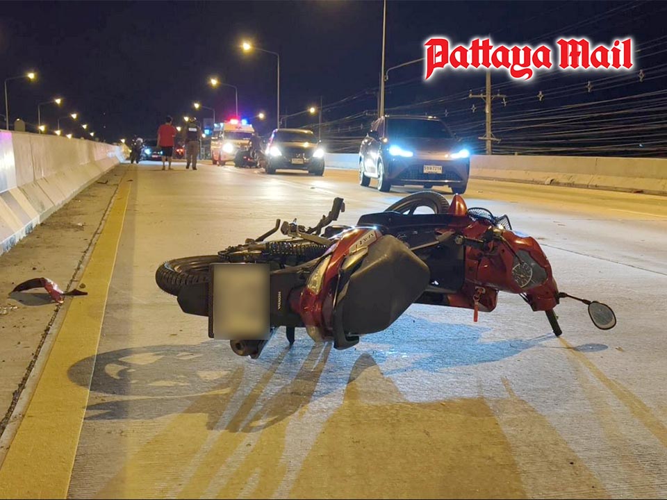 PATTAYA, Thailand – At approximately 1:30 a.m. on March 1, the Sattahip Police radio center received reports of a serious motorcycle accident on the U-turn bridge near Rattanakorn Market on Sukhumvit Road, inbound to Pattaya, in Sattahip sub-district, Chonburi. Officers rushed to the scene and coordinated with rescue volunteers for emergency assistance.