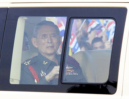 His Majesty King Bhumibol Adulyadej the Great arrives in Ayutthaya province, Friday, May 25. Thousands upon thousands of Thais turned out in the historic capital Ayutthaya to show their devotion to the King on his first trip outside Bangkok in almost three years. (AP Photo/Courtesy of the Royal Household)