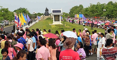 HM the King’s first stop was at a statue of Queen Suriyothai, a consort of an Ayutthaya-era king who sacrificed her life in battle with the Burmese to save her husband. HM the King handed over a garland from his van for an official to place before the statue.