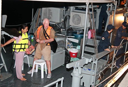 The First Naval Area Command found British national Raymond Luggman, 75, and his wife Ubolrat Nikornpol, 49, in a rubber life boat just after midnight March 4 about three nautical miles off Koh Era. The Rescue crew provided first aid, food and water before taking the pair to Queen Sirikit Naval Medical Center in Sattahip for evaluation.