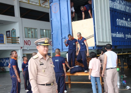 Foundation President Somdhavin Yungyoo, representing HRH Princess Soamsawalee, who founded the organization, the Thai Red Cross, and 50 Air and Coastal Defense Command personnel loaded 2,320 bags of provisions onto two trucks bound for the flood-stricken region Aug. 1.