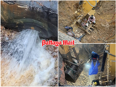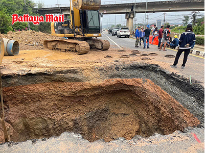 Local residents expressed anger as a neglected ruptured water pipe leads to a cave-in on Sukhumvit Road in Plutaluang, Sattahip as workers begin repairs.