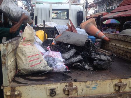 Nongprue Municipal Sanitation officers clean waste from sewage pipes. The back of the lorry is filled with refuse they dug out.Nongprue Municipal Sanitation officers clean waste from sewage pipes. The back of the lorry is filled with refuse they dug out.