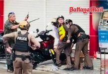 Suntorn Saengthong of Tawornboon Engineering Co. was corralled by residents on Soi Mabtato 2 Jan. 23 after he rolled through their neighborhood around 8 p.m. with a JCB carrier (hydraulic lifting arm) too tall for the local wiring.