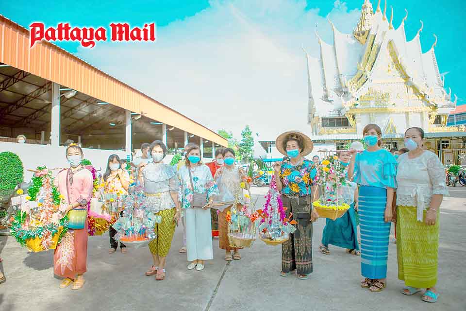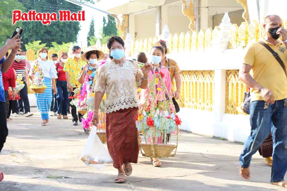 Residents of 14 subdistrict communities joined up April 16 for a parade through Sutthawat Temple. People dressed in traditional flowered shirts and carried baskets of dried fruit and other food and cash on shoulder poles.