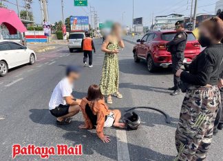 Motorcycle and car collision leaves one woman injured on Sukhumvit Road...