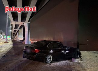 BMW crashes into median and slams billboard near Pattaya motorway exit,...