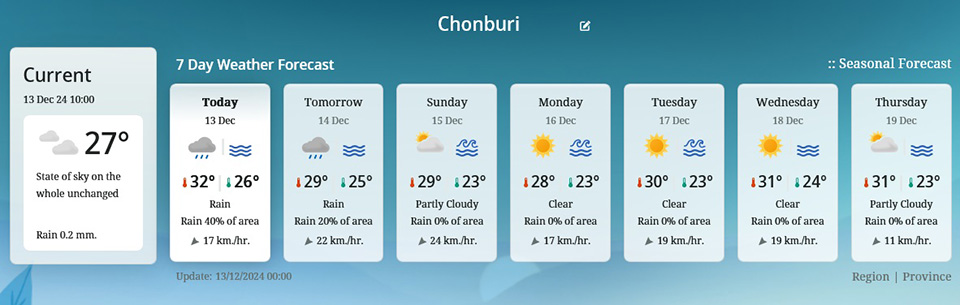 East: 40% chance of rain in areas like Chonburi (Pattaya) and Rayong, followed by cooler mornings with strong winds. Low: 21-25°C, High: 29-32°C.