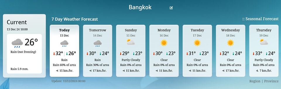 Bangkok and Vicinity: 40% chance of rain, followed by cooler mornings with strong winds. Low: 22-25°C, High: 30-33°C.