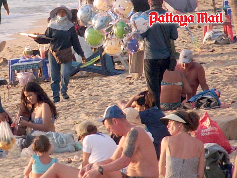Foreign families enjoy a relaxed afternoon along Jomtien Beach in Pattaya, as some international travelers affected by flight disruptions choose to extend their stay by the sea while waiting for new travel arrangements. (Photo by Jetsada Homklin)