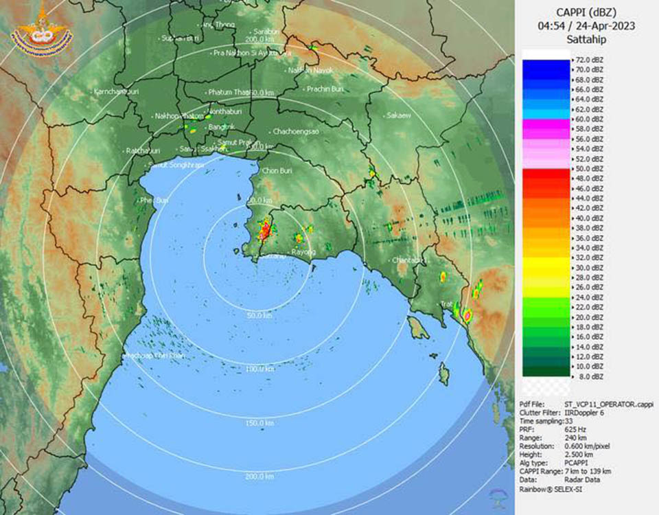 Day hot and haze. Scattered thunderstorms with isolated gusty winds and hail mostly in Nakhon Nayok, Prachinburi, Sa Kaeo, Chachoengsao, Chonburi (Pattaya), Rayong, Chanthaburi and Trat. Minimum temperature 25-29 °C. Maximum temperature 34-39 °C. Southeasterly winds 10-30 km/hr. Wave below 1 meter and above 1 meter in thundershowers.