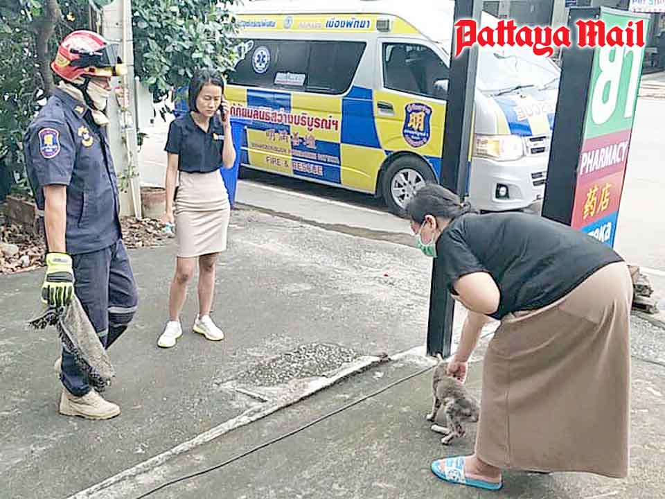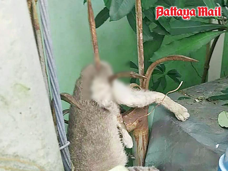 A cat impaled on a metal bar for two days needs a human to help it recover. Sawang Boriboon Thammasathan Foundation volunteers cut the male stray from the top of a metal-spiked wall behind the Marine Pharmacy Shop in Soi Chaiyapruek 2 Feb. 16.