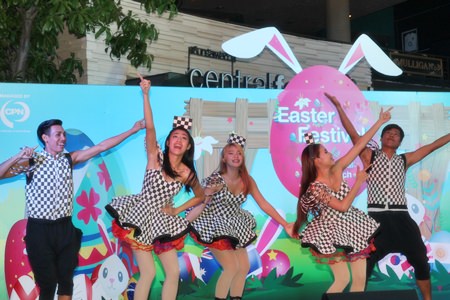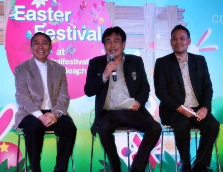Pattaya Deputy Mayor Ronakit Ekasingh, Father Ray Foundation President Rev. Peter Pattarapong Sriworakul and Montree Wonghirandecha from the amusement park take to the stage to announce the East’s first Easter Festival March 25-27 at Central Festival Pattaya Beach.
