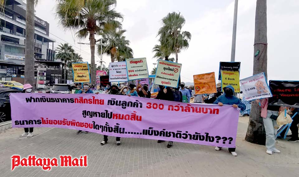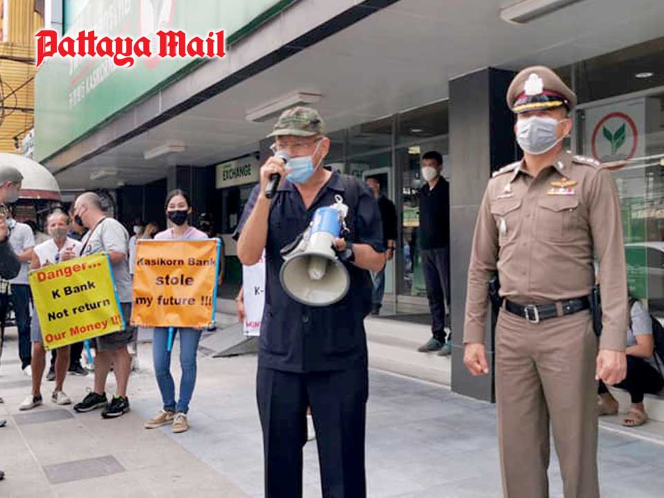 About 50 victims of an alleged scam perpetrated by a former Kasikornbank manager demonstrated outside Pattaya Police Station to demand action in their case and threatened to take their protest to Bangkok next month.
