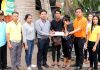 Bandit Siritanyong (right), vice chairman of the Thai-Chinese Culture and Economic Council, presents 11 scholarships worth 20,000 baht each, to Mayor Itthiphol Kunplome to give to students from each of the 11 public schools in Pattaya.