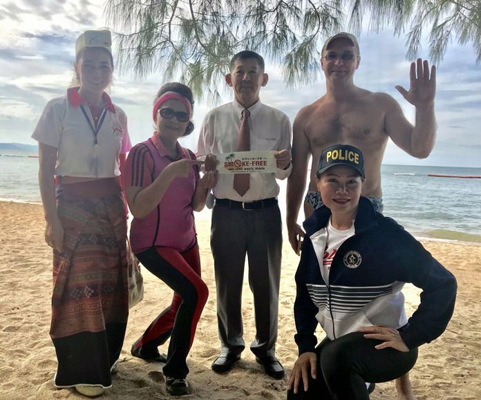 Mayor Anan Charoenchasri, city council members and Marine Department officials marched along Dongtan Beach Dec. 4, handing out flyers and waving signs notifying beachgoers that, starting Feb. 1, they faced stiff penalties for lighting up on the sand.