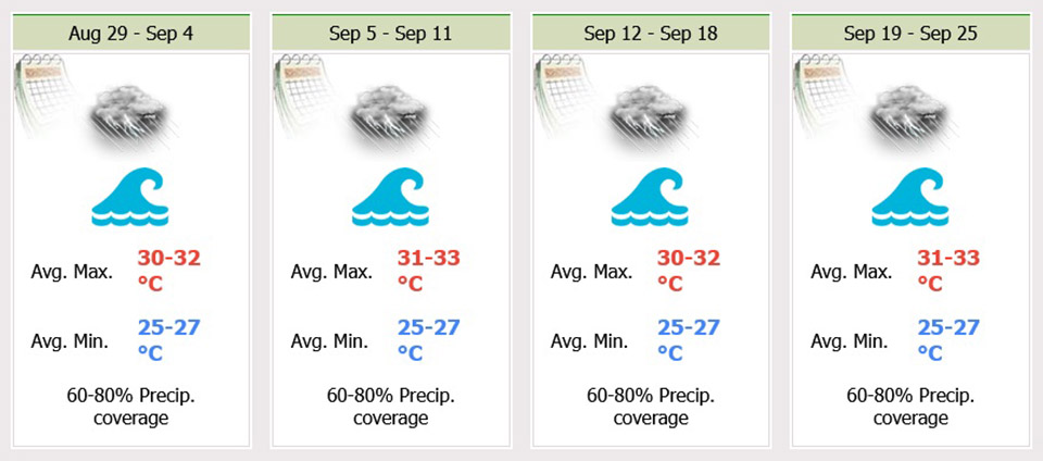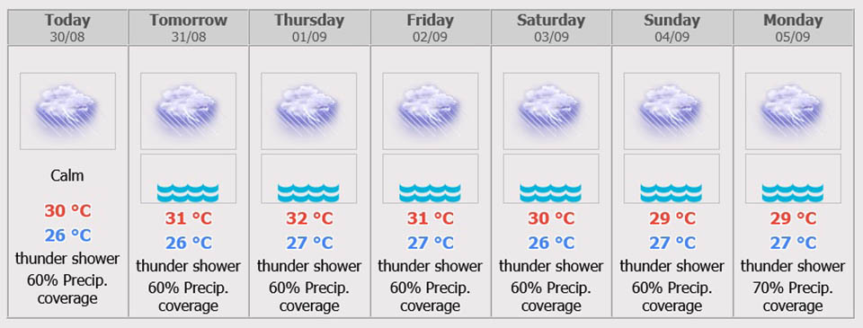 Minimum temperature 24-26 °C. Maximum temperature 32-34 °C. Southeasterly winds 10-30 km/hr. Wave below 1 meter and above 1 meter in thundershowers.