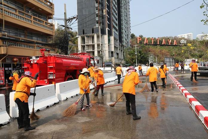 Armed with industrial disinfectant, Mayor Sonthaya Kunplome and top city officials on March 19 sprayed and wiped down the Bali Hai Pier area. Volunteers cleaned doors, windows, railings, and roads before they walked the pier, handing out information on preventing spread of the coronavirus.
