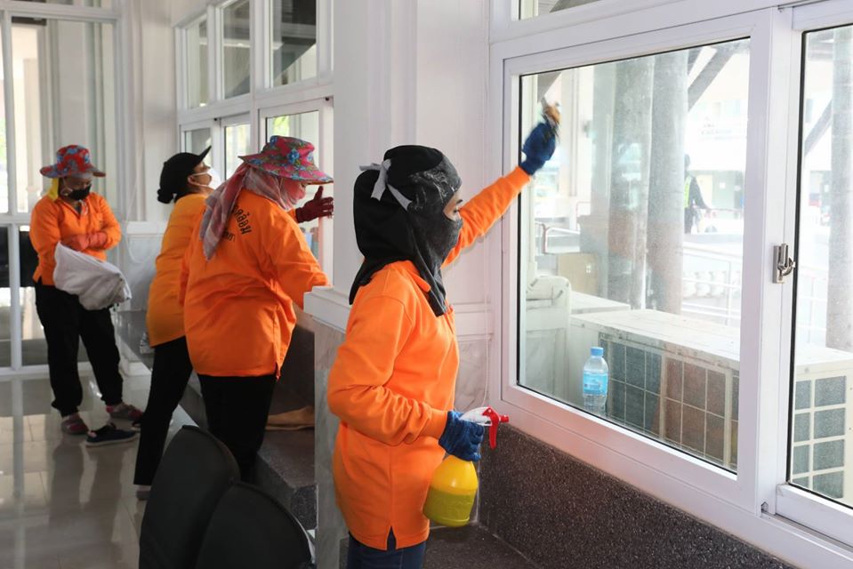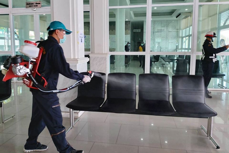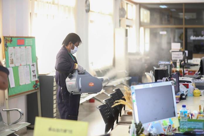 Meanwhile, the district chief and his top deputies were doing the same thing at the Banglamung offices. Civil defense volunteers and police from Banglamung Station joined in the effort to clean and spray disinfectant inside and outside the building.