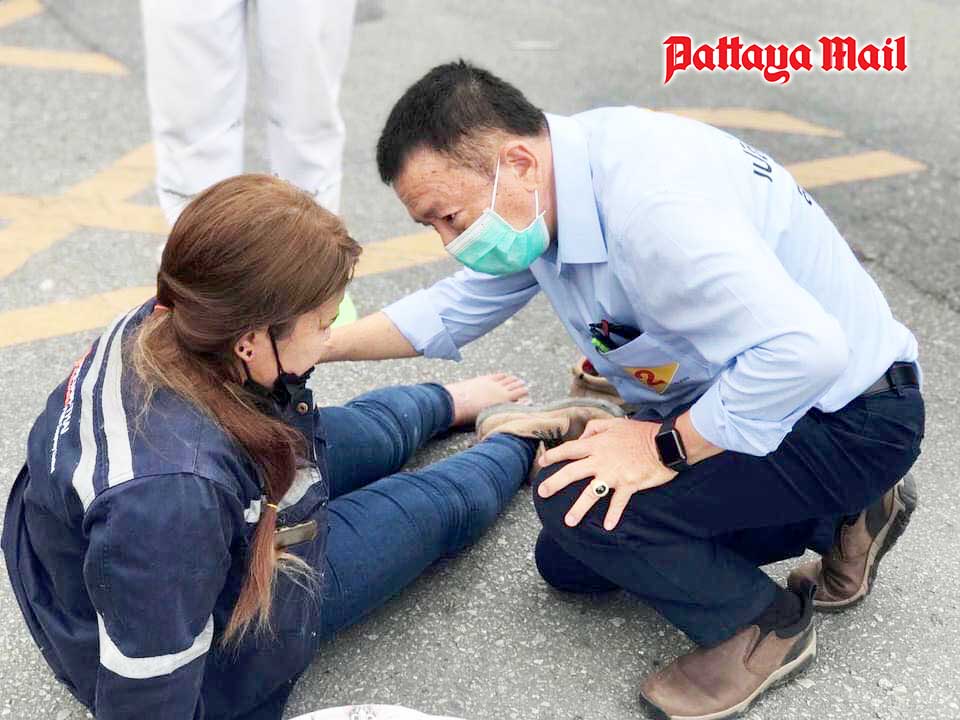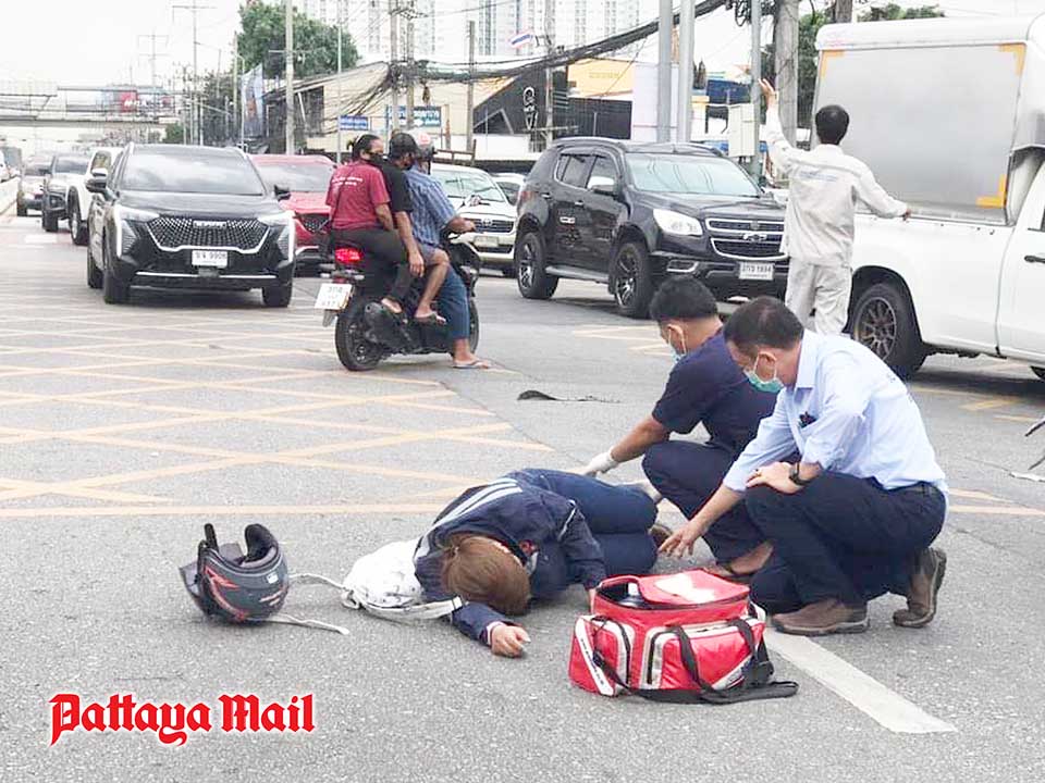 Former Banglamung District chief Sakchai Taengho on April 18 said he spotted an accident in which a motorcycle crashed at the Wat Sawangfah intersection on Sukhumvit Road in Naklua. Two people were hurt. He stopped turned on the hazard lights of his car to get passing traffic to slow down before calling paramedics.