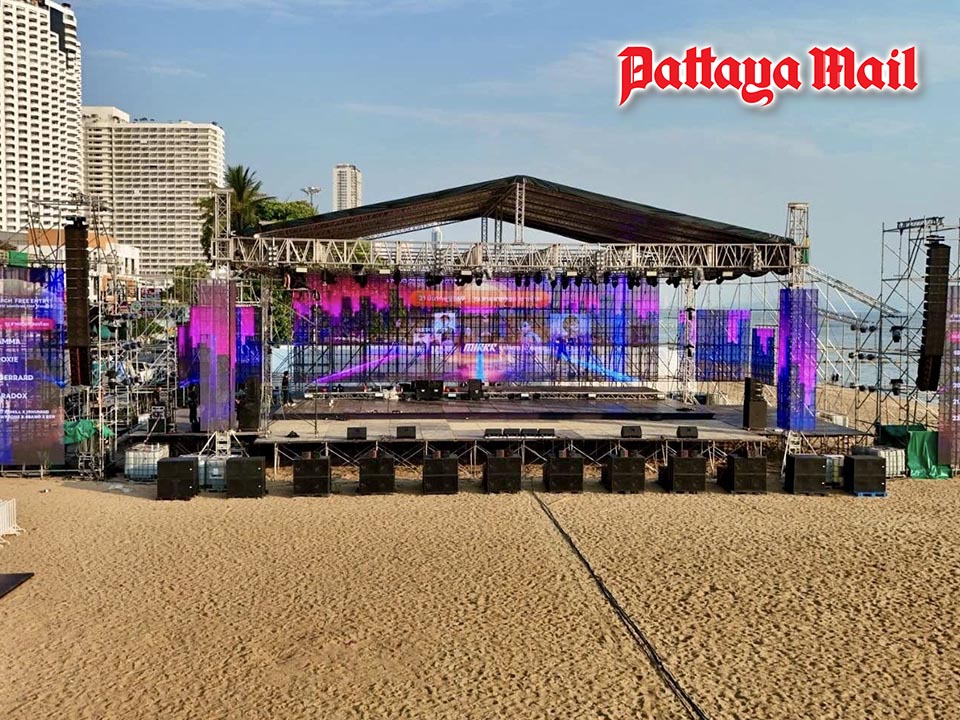 Stages are being prepared along Jomtien Beach ahead of the upcoming Pattaya Music Festival 2026, where popular Thai artists are set to perform during the second weekend of the beachfront event.