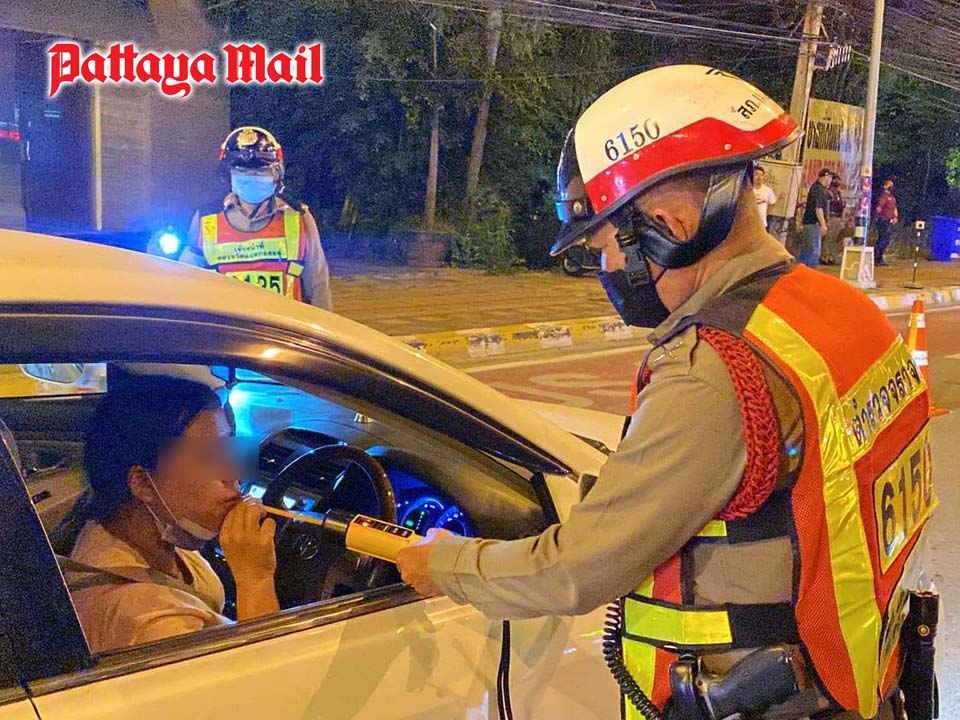 Pattaya police set up a drunk-driving checkpoint on Thappraya Road, one of many to come under a directive from the Royal Thai Police Office.