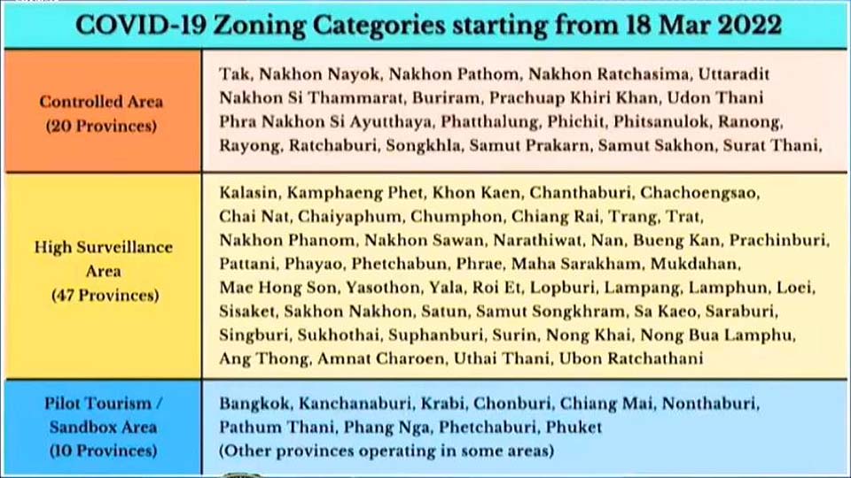 Meanwhile, the COVID-19 zoning has been re-categorized and was in effect from 18 March 2022 onward. The new zoning is “Controlled Area,” which are 20 provinces; “High Surveillance Area,” which are 47 provinces; and “Pilot Tourism/Sandbox Area,” which are 10 provinces.