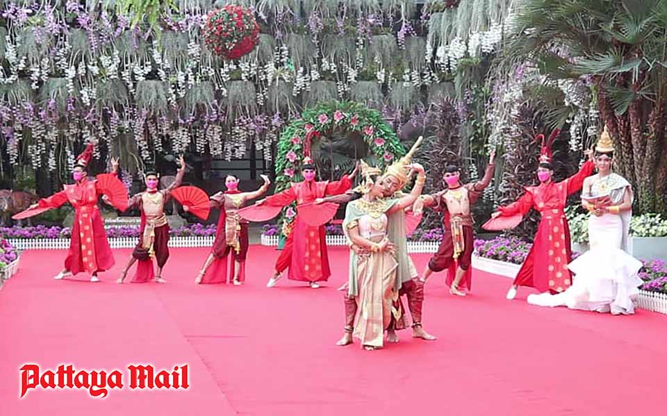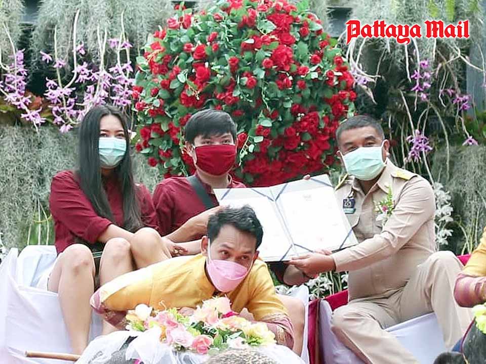 The wedding celebration also included more than 40 other couples who registered their marriages and enjoyed a ‘Khon’ mask parade at Nong Nooch’s Sky Garden.