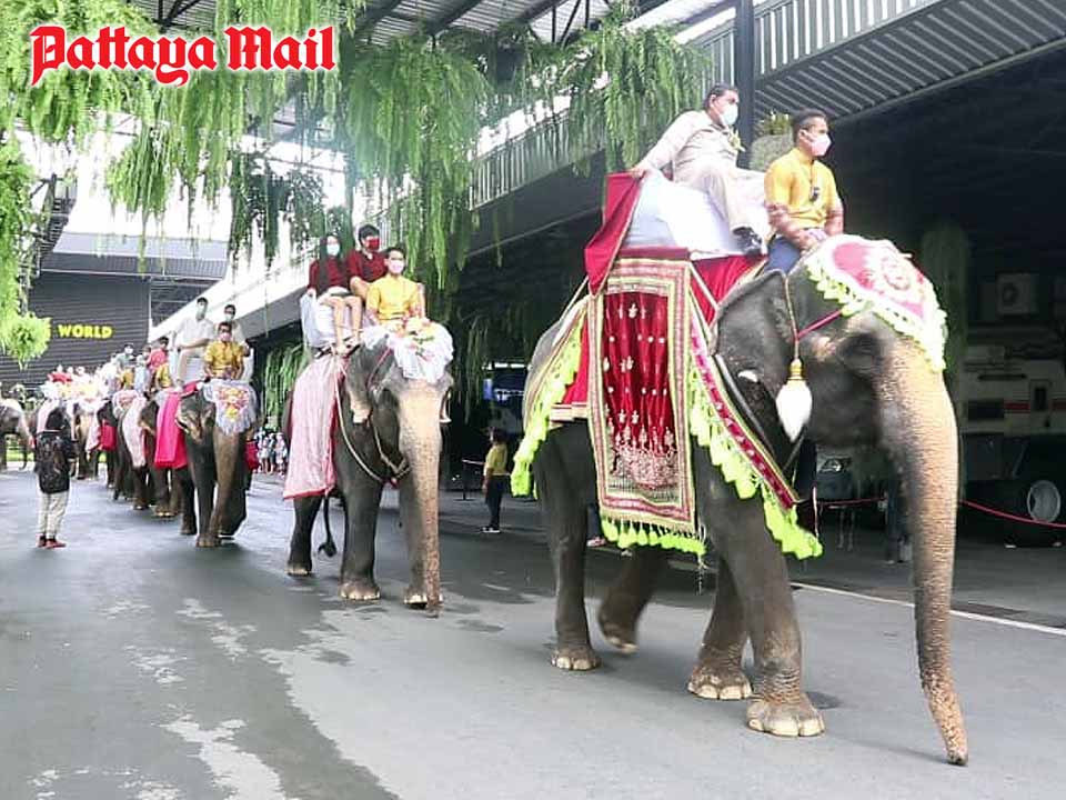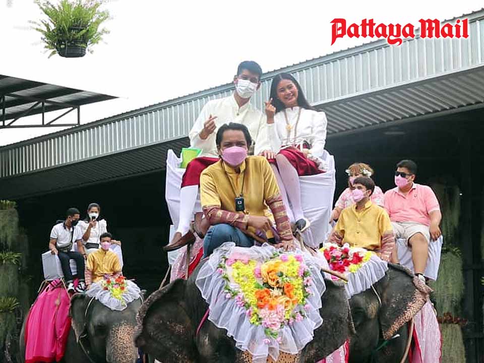 Nine pairs of lovers became legal couples while riding elephants on Feb. 14 at Nong Nooch Tropical Garden. Sattahip District Chief Chatchai Sriphoon and park General Manager Pattanan Kantisukkapan did the formalities as the brides and grooms completed their marriage vows.