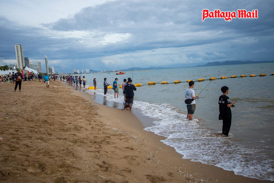 Enthusiastic participants cast their lines into the sea at the Pattaya Squid Fair 2024, hoping to catch the biggest squid and claim victory.