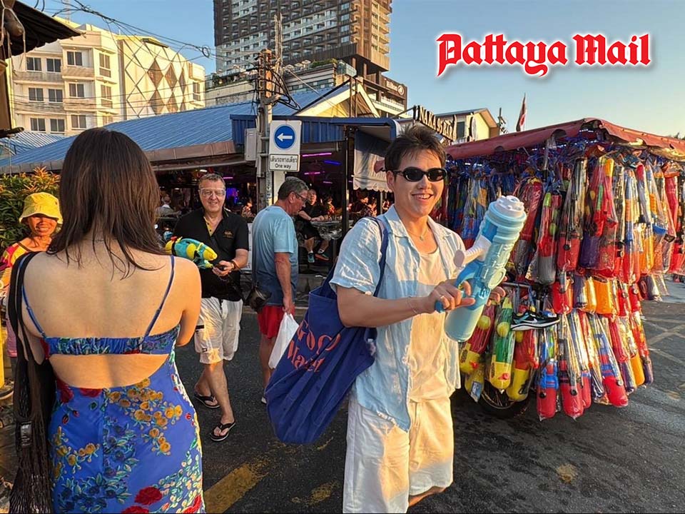 Beating the heat, tourists soak up the fun on Soi 7–8 along Pattaya Beach Road as early Songkran water fights bring relief and energy to Pattaya’s sweltering streets.