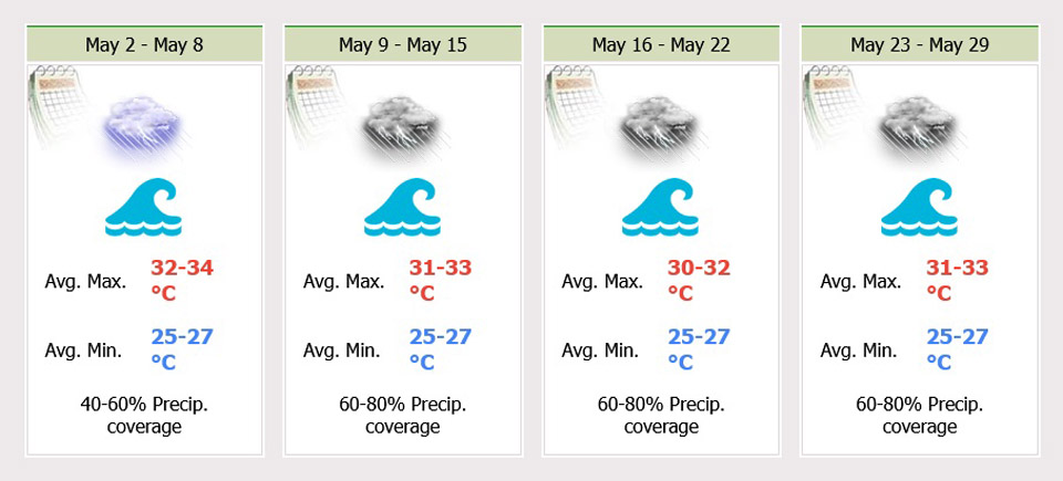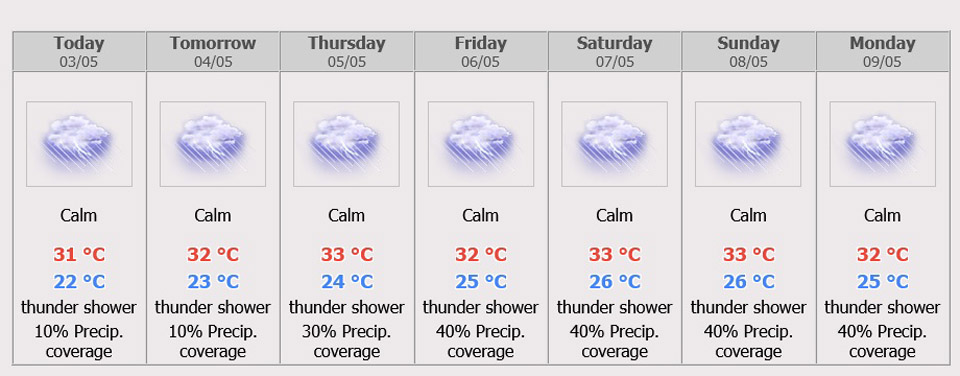 During 3 – 4 May, isolated thundershowers mostly along the eastern coast. Minimum temperature 21-26 °C.Maximum temperature 29-34 °C. Easterly wind 10-20 km/hr. 15-30 km/hr. Wave height about 1 meter and above 1 meters in thundershowers.