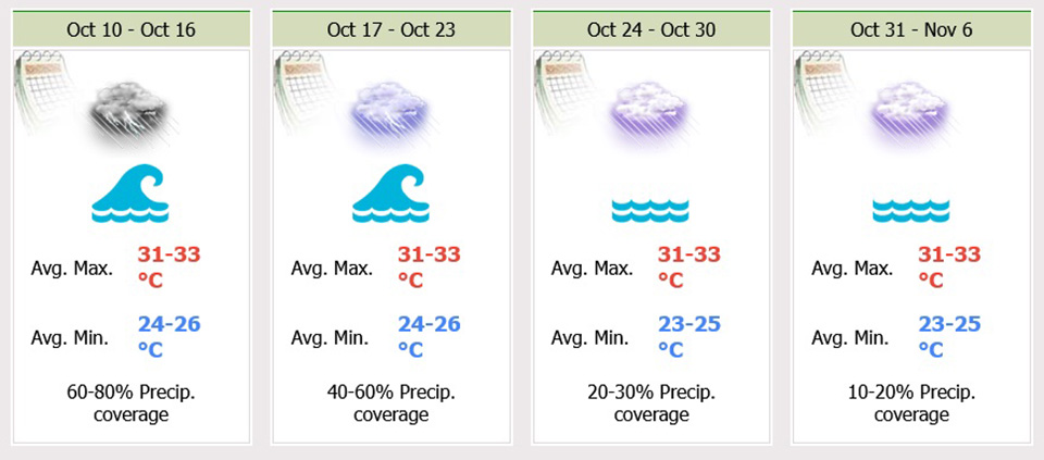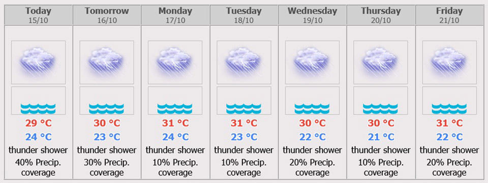 During 17 – 21 Oct, isolated thundershowers with strong wind, 1 – 3 °C drop in temperature. Northeasterly winds 15-35 km/hr. Wave height 1 – 2 meter and above 2 meter in thundershowers. Minimum temperature 20-24 °C. Maximum temperature 29-32 °C.