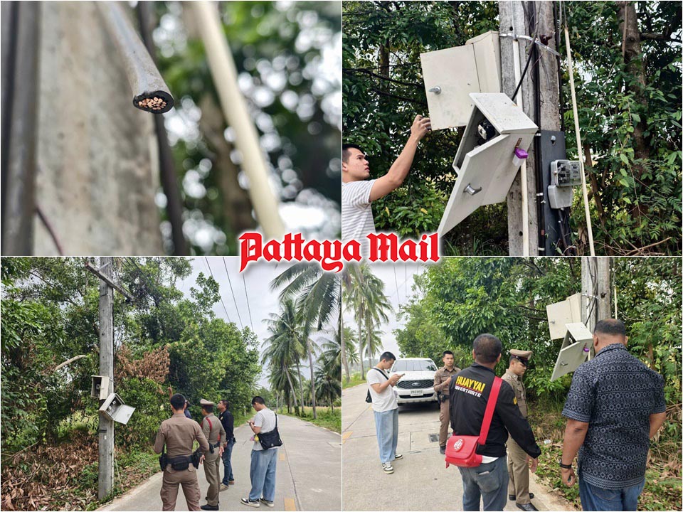 PATTAYA, Thailand – An entire community in East Pattaya, was left in darkness after thieves stole copper wiring from a street-light control cabinet late on December 11. The incident was discovered by Weeraphan Kajarern, an officer from Khao Mai Kaew Subdistrict Municipality, who said he noticed a control cabinet in Moo 3 standing open and tilted in an unusual way while he was driving to inspect the area. When municipal staff checked inside, they found that both external and internal copper wires had been cut and stolen—including cables connecting all the way to the main transformer.