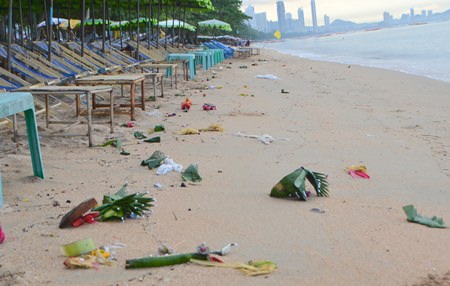 Jomtien Beach was littered with floats, balloons, discarded bottles, bags and food containers left behind by revelers.
